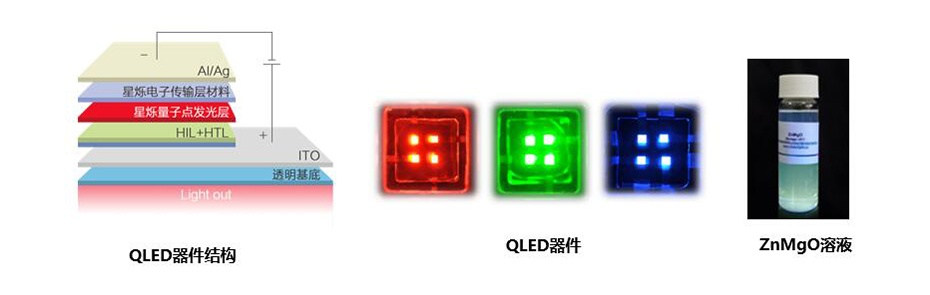 配套产品:星烁QLED配套产品ZnMgO NPs,经由专利技术制备,对可见光的吸收较弱,其透过率超过98%,可提高电子注入势垒和平衡载流子注入。搭配星烁量子点,通过旋涂ZnMgO溶液制备得到的红、绿、蓝QLED,其外量子效率分别超过18%,15%,8%。